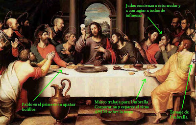 Por ejemplo, parte de la teoría de Alexander Wagner, al igual que el libro de Dan Brown, se basó en la pintura de la última cena (no me acuerdo de qué autor es esta). En ella se podrán dar cuenta de algo muy intrigante que tiene todo que ver con la epidemia de influenza. Den click y observen con mucha atención la imagen de abajo y hallarán la pista que dejó el pintor.