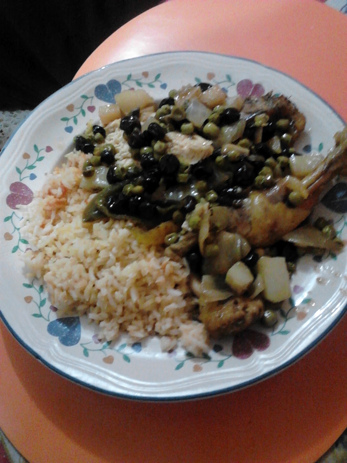 Y esto hizo mi mamá antier. Un pollo con arroz, pasas y otros vegetales que desconozco (yo solo como, nunca pregunto), que tenía un jugo riquísimo que, ¡alaverga! ya se me antojó otra vez.