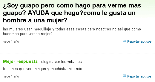 Dos palabras: Chingón y Machista. Sé chingón, sé machista. Incluso al decirlo se siente una especie de celebración en la boca que rápidamente se propaga por todo nuestro sistema nervioso. Chingón y Machista, recuérdalo bien. Todo se le perdona a las personas chingonas y machistas por el siemple hecho de ser chingones y machistas. Chingón y Machista es la respuesta correcta en todos los examenes de la universidad. Si alguna vez no sabes qué responder, escribe eso, y el profesor te pondrá 10. Pero de eso escribiré otro día.